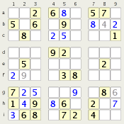 Mientras tanto, si usted puede resolver este Sudoku de una forma deductiva (sin adivinanzas), aquí es otra oportunidad a demonstrar sus habilidades superiores de Sudoku. Sigue los enlaces al Analizador de Sudoku, y de allí a la página del Reto de Sudoku para decirme como usted lo resolvió. Como siempre, prometo a publicar su buen éxito.