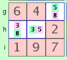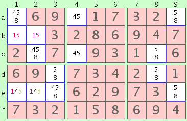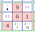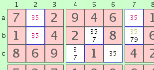 Por ejemplo, dos celdas en el mismo cuadrado 3x3 puede contener tanto sólo las dos posibilidades '3' y '5' (un '
