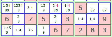 Cuads Desnudos', monopolizados por las 4 otras celdas. Entonces, podríamos eliminar los 4 números de las 2 celdas, dejando '7' y '9' allá. Es una cuestión de cual estratégia es mas fácil a reconocer.