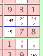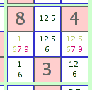 De la misma manera, si la respuesta sea 'Sí' para el 3x3 y 'No' para la fila, usted pueda eliminar la '4' de las otras 6 celdas en el 3x3. Esta lógica también se aplica a la intersección de 3 celdas de cuadrados 3x3 con columnas.