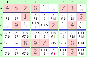 De la misma manera, si no hubiera posibilidades para un '8' en columnas '6' ni '9', podríamos haber eliminado cualquier '8' en otras celdas de las filas 'a' y 'f'.