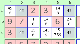 Por ejemplo, el número '4' puede ser posible en 2 o 3 celdas en una fila de un 3x3. Entonces, compruebe las otras 6 celdas en el mismo cuadrado 3x3 y las otras 6 celdas en la misma fila completa, si alguno de ellos también contienen un posible '4'. Si la respuesta es 'Sí' para la fila completa y 'No' para el 3x3, es posible eliminar el número '4' de las otras 6 celdas de la fila completa.